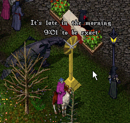 UOの時計ってすべてあっていませんよねぇ。掲示板にしろ、普通の時計にしろ…時間をあわせる方法ってあるのでしょうか?(アメリカに合わせてるのだろうか?たぶん違うな)。