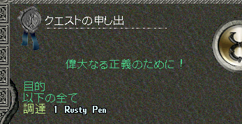 裁判所にもどると目的のpenが手に入ります。ただし、このpenはまだ本来にpenになっていない(黒っぽい感じのpen)なので、最初の正義の神殿に行き、このpenをクエスト指定します。すると目的のpen(緑っぽいpen)となります。(神殿でpenの色を変えるのは、後で神殿クエストが全部終わってから、まとめて出かけても良いです)。とりあえず正義クエストは終了となります。