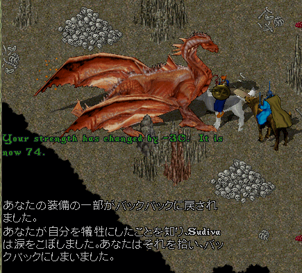 ただし、やっかいなのはcovetos4階にこの龍がいるのです。ソロの場合歩いて1階から行くのはリッチ等の魔法系モンスが結構いますのでかなり危険です。複数なら大丈夫でしょう。Sudiviaの龍のポイントには直接移動魔法で行くことはできないので、すぐ上の3階でルーンを焼いておくと良いでしょう。幸いM.JEFFRYさんが私とTAROSAさんをつれてcovetosまで運んでくれたので楽勝でした。また助かりました。ありがとう。