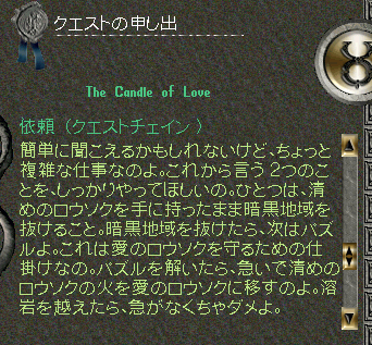 さらに補足:昨日のロウソクを使って再度溶岩ダンジョンパズルに行ってきました。すると、クエスト表記が出ましてacceptしましたら、ついに銘入りロウソクをゲットしました!