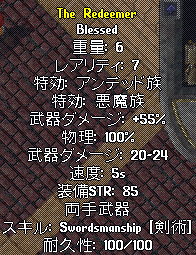 何とbless属性!ダメージ55!アンデッド&悪魔のダブル特効!と良さそうなのですが、振りが5Sで遅く、耐久は100で天ぷら粉で上がらないのかな?