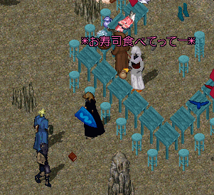 まずは鉱山の中に行商中のお寿司屋さん。机と椅子の色が何とも綺麗ですね。